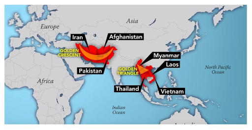 India's geographical location between the "Golden Crescent" (Afghanistan, Iran, Pakistan) and the "Golden Triangle" (Myanmar, Laos, Thailand) makes it vulnerable as both a transit route and an end market for illicit drugs.