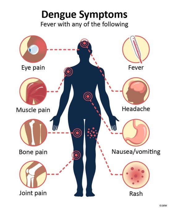 - Symptoms include fever, headache, muscle, and joint pain, and a characteristic skin rash that is similar to measles. There is a drop in platelets.