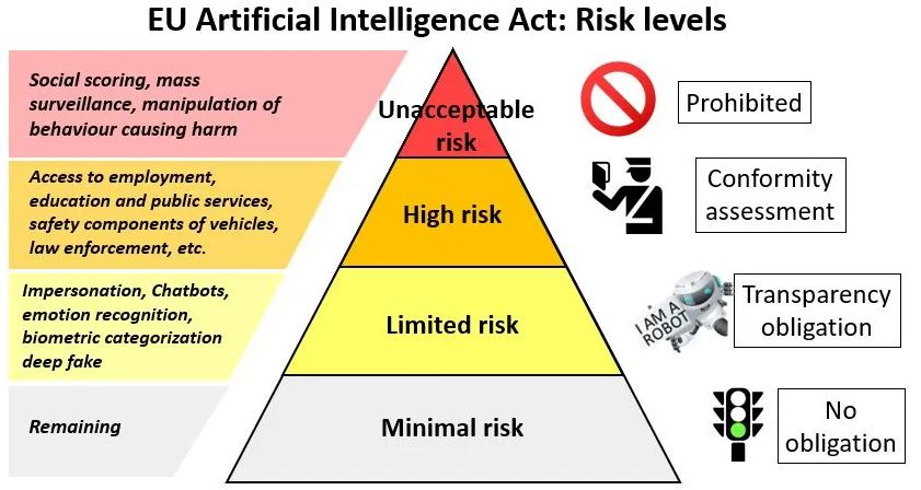 - Prohibited: Systems that breach fundamental rights or pose unacceptable dangers, such as social assessment, which generates biassed "risk profiles" of people based on their behavior.