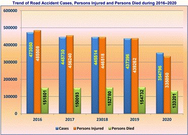 - In 2020, there were about 3.5 lakh road accidents in India, which killed about 1.3 lakh people and injured about 3.3 lakh people.
