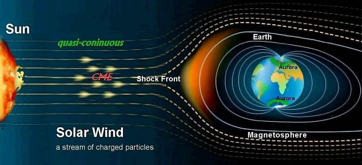 This is the region of space dominated by Earth's magnetic field. It is compressed on the side facing the Sun and stretched into a long "tail" on the opposite side by the pressure of the solar wind.