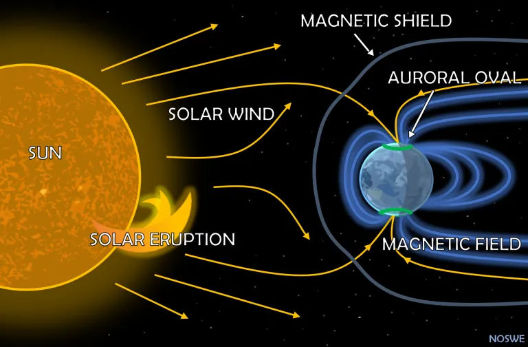 When charged particles from the Sun are captured by the field and funnelled toward the poles, they collide with atmospheric gases to create the Northern and Southern Lights.