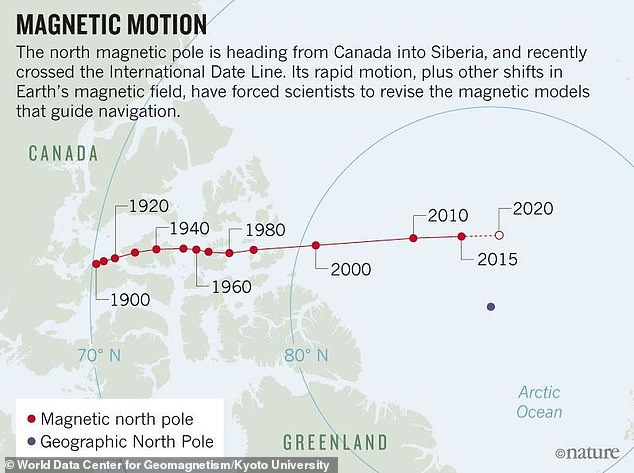 Unlike the fixed geographic poles, the magnetic poles are constantly moving. The North Magnetic Pole is currently drifting from Canada toward Siberia at about 40-55 km per year.