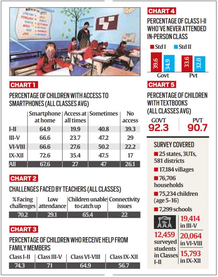 Increase in private tuition: 42% of students depend upon the private tuition up from 32.5%.This is seen as a natural outcome of families seeking external support due to the prolonged closure of schools.