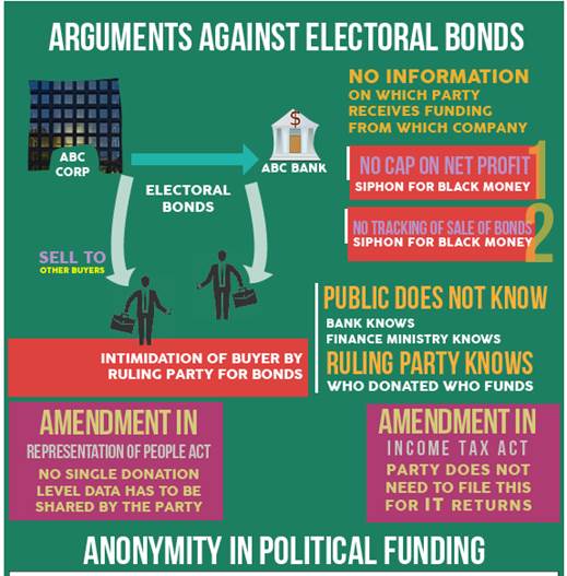 - The electoral bonds scheme has opened floodgates to unlimited corporate donations to political parties and anonymous financing by Indian as well as foreign companies which is a threat to Indian democracy.