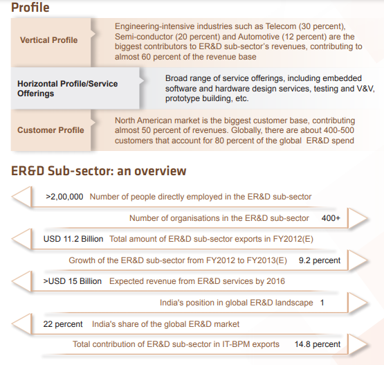 ER&D Sector: Engineering and R&D (ER&D) services are those that augment or manage processes that are associated with the creation of a product or service, as well as those associated with maximising the life span and optimising the yield associated with a product or asset.