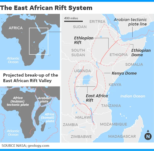Mantle Plume: A massive upwelling of superheated rock from the Earth's mantle, known as the African Superplume, is believed to be accelerating this rifting process.