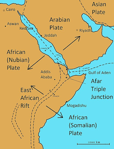 The Afar region is a triple junction where three tectonic plates are pulling away from each other.