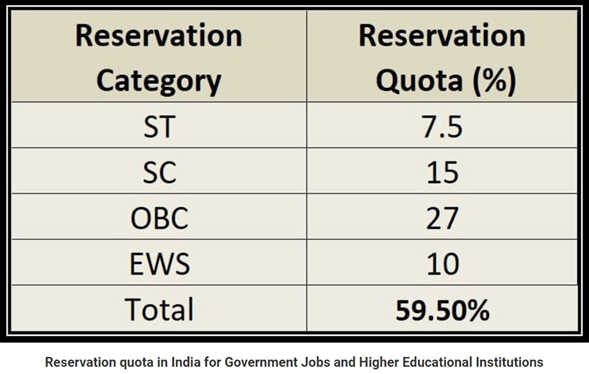 - In India, about 60% of seats are reserved for various sections like ST, SC, OBC, and EWS in Government jobs and Higher Education Institutions.