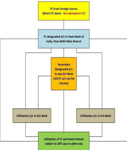 - Under the Act, a registered person must accept foreign contribution only in a single branch of a scheduled bank specified by them. However, they may open more accounts in other banks for utilisation of the contribution.