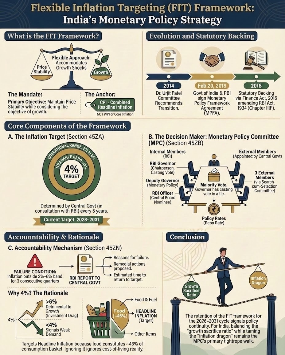 The Government notified the retention of the Flexible Inflation Targeting (FIT) framework with a 4% retail inflation target (within a 2% to 6% tolerance band) for the five-year period from April 1, 2026, to March 31, 2031.