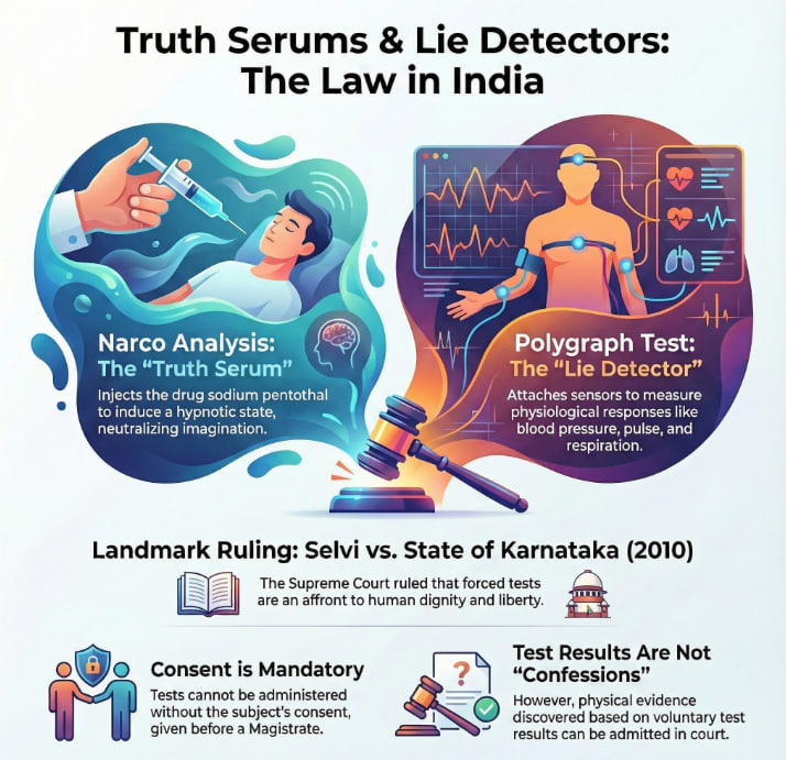 The Supreme Court's 2025 Amlesh Kumar vs State of Bihar ruling upheld the Selvi precedent: forced narco-analysis violates Articles 20(3) and 21. While test results are inadmissible, evidence discovered through the test may be admissible, emphasizing mental privacy and adherence to rights.