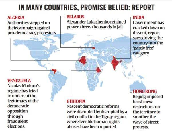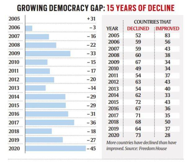 Context: Authoritarian actors grew bolder during 2020 as major democracies turned inward, contributing to a 15th consecutive year of decline in global freedom, the flagship annual report of Freedom House.