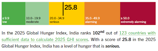 The 2025 Global Hunger Index shows hunger progress stalled since 2016, with 56 countries set to miss the 2030 'low' hunger target. India ranks 102nd with 'serious' hunger, primarily due to child malnutrition. Conflict and climate change are major factors, necessitating renewed global efforts for Zero Hunger.