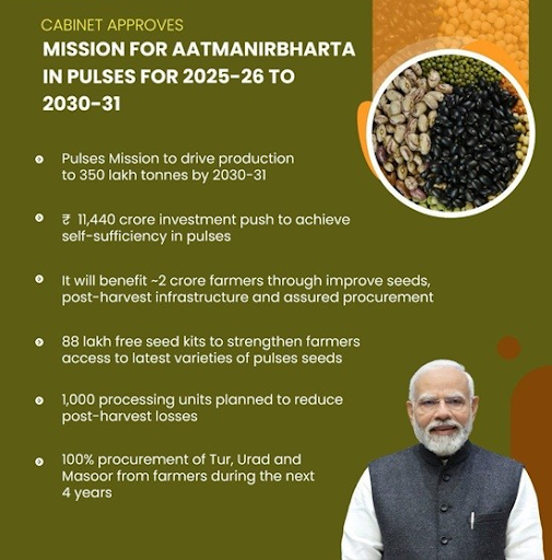The Union Cabinet approved the National Pulses Mission (2025–31) to boost domestic pulse production and reduce import dependency.