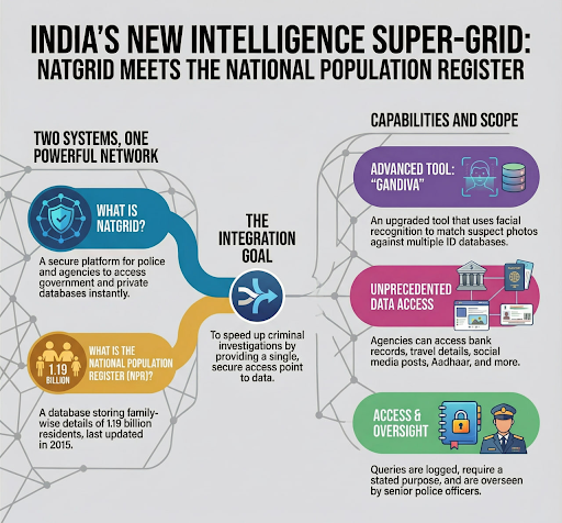 The National Intelligence Grid, created after 26/11 to break agency silos, integrates data from 21 sources for counter-terrorism. Its linkage with the National Population Register raises privacy concerns. A strong legal framework, independent oversight, and privacy-by-design safeguards are vital to balance security with fundamental rights.