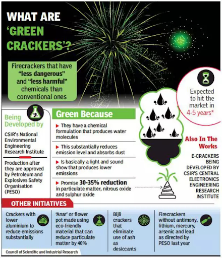 Green crackers are not pollution-free; they are less-polluting alternatives to conventional firecrackers, developed by the Council of Scientific and Industrial Research-National Environmental Engineering Research Institute (CSIR-NEERI).