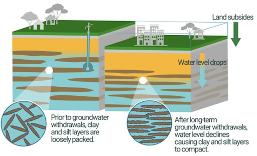 When groundwater is extracted, the hydrostatic pressure supporting the soil and rock layers decreases, which causes the land above to subside.