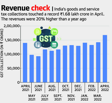 - India’s gross Goods and Services Tax (GST) revenues hit a fresh high of Rs 1,67,540 crore in April, with revenues from goods imports rising 30% year-on-year and domestic transactions, along with services imports, rising 17%.