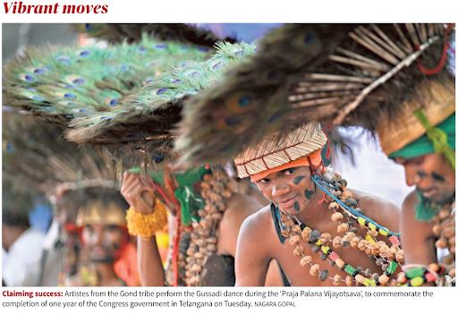 Recently, artists from the Gond tribe performed the Gussadi dance during the ‘Praja Palana Vijayotsav’ to commemorate the completion of one year of the Congress government in Telangana.