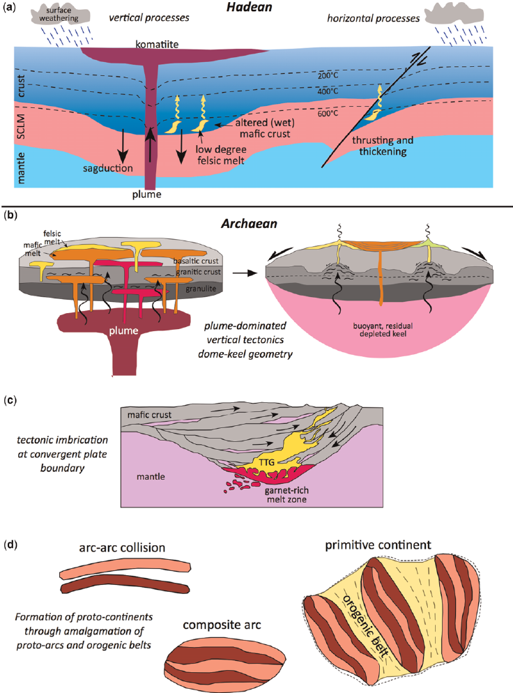 Possibly vertical tectonics (sagduction); very early horizontal movements debated |
