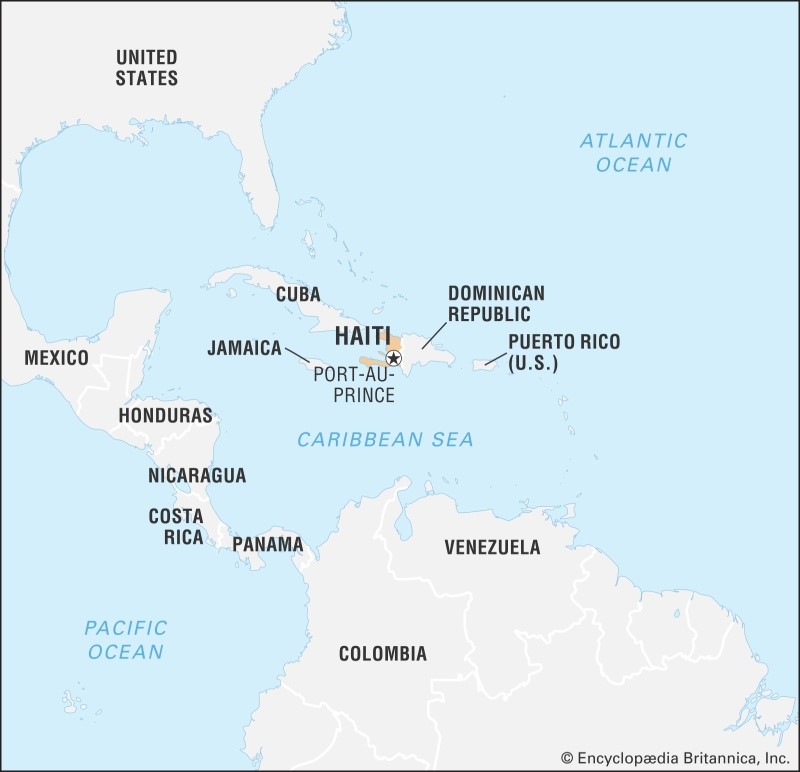 Haiti is located on the island of Hispaniola in the Greater Antilles archipelago of the Caribbean Sea, to the east of Cuba and Jamaica and south of The Bahamas and the Turks and Caicos Islands. It occupies the western three-eighths of the island which it shares with the Dominican Republic.