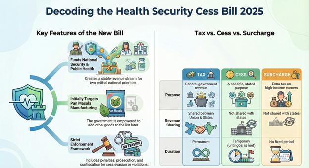 Purpose of the Cess: The Bill introduces a special excise cess to fund national security and public health needs via a stable revenue stream.