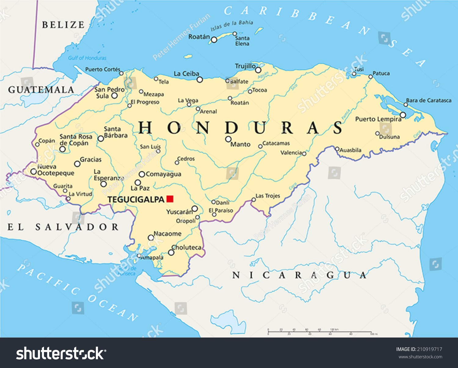 Guatemala to the west; El Salvador to the southwest; Nicaragua to the southeast; Pacific Ocean at the Gulf of Fonseca to the south; Caribbean Sea at the Gulf of Honduras to the north. |