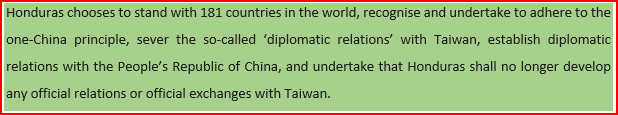 Context: China and Honduras signed a landmark communique to formally establish diplomatic relations, with the Central American nation becoming the latest country to switch recognition from Taipei to Beijing.