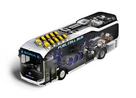 - Hydrogen fuel cells like the one present in the bus produce electricity by combining hydrogen and oxygen atoms. The two gases react across an electrochemical cell similar to a conventional battery cell to produce electricity, water and small amounts of heat. This electricity is then used by electric motors to propel the vehicle forward.