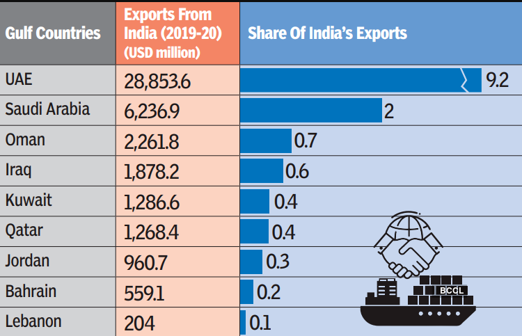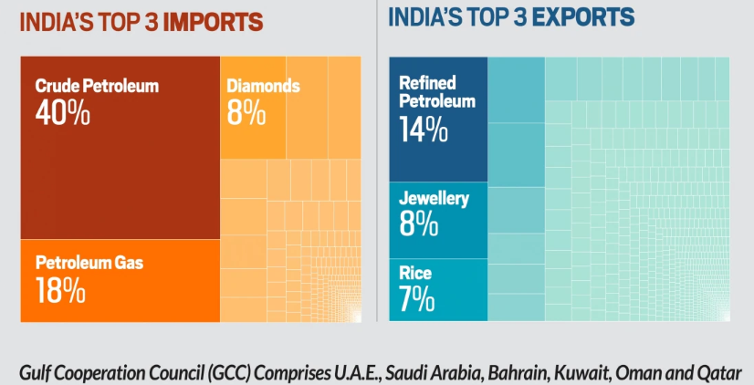 - In 2021-22, India’s bilateral trade with the GCC stood at nearly $154 billion and its trade deficit at around $67 billion.