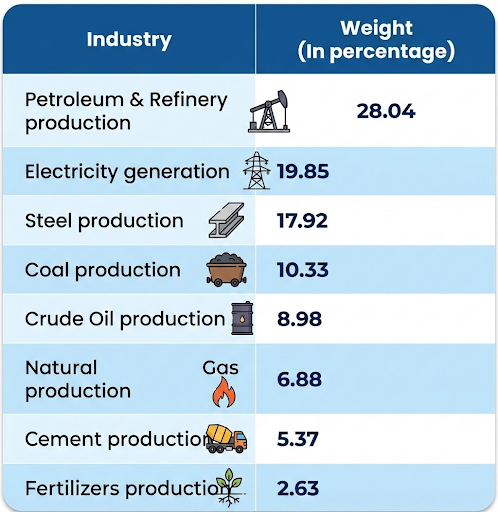 Nearly 40.27% of the IIP comprises the Index of Eight Core Industries (ICI). These are considered the structural pillars of the Indian economy.