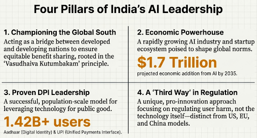 India aims to shape global AI governance by hosting the AI Impact Summit 2026, positioning itself as the Global South’s voice. Adopting a balanced, risk-based regulatory approach, it leverages the IndiaAI Mission and Digital Public Infrastructure to promote innovation while mitigating harms, despite gaps in AI-specific law and data protection.