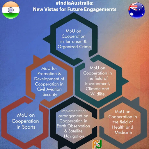 · India’s and Australis share the same vision “free and open Indo-Pacific” with a rules-based order and open market economies, along with the freedom of navigation in high seas and overflight.