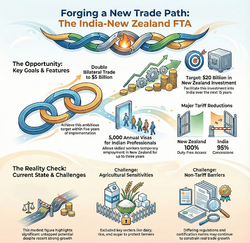 India and New Zealand concluded FTA to double trade to $5 billion by 2030. It grants zero-duty access to Indian exports, protects dairy, secures $20 billion investment, opens visas and STEM mobility, and strengthens Indo-Pacific ties aligned with Viksit Bharat.