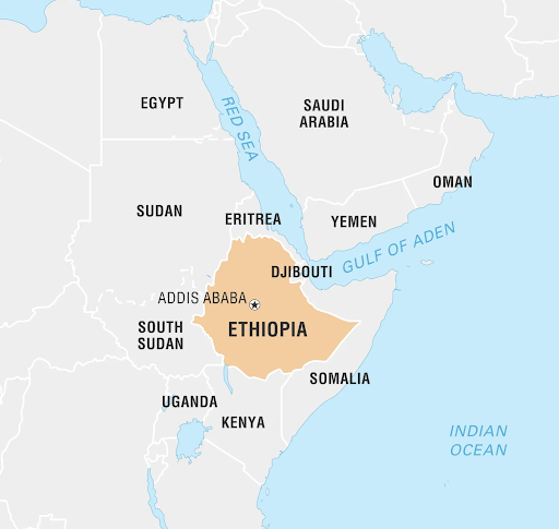 Ethiopia is a landlocked country located in the Horn of Africa, East Africa, bordered by Eritrea, Djibouti, Somalia, Kenya, South Sudan, and Sudan. |