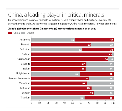 India's tech industry is highly dependent on imports. China processes over 60% of the world's lithium and 90% of rare earth elements. India imports nearly 100% of its lithium and cobalt needs. (Source: IEA)