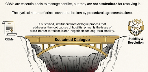 CBMs manage, not resolve, conflict. They can't replace sustained dialogue addressing the root cause: cross-border terrorism.