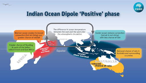 Disasters: Extreme IOD events are linked to severe bushfires (Australia, 2019) and devastating floods.