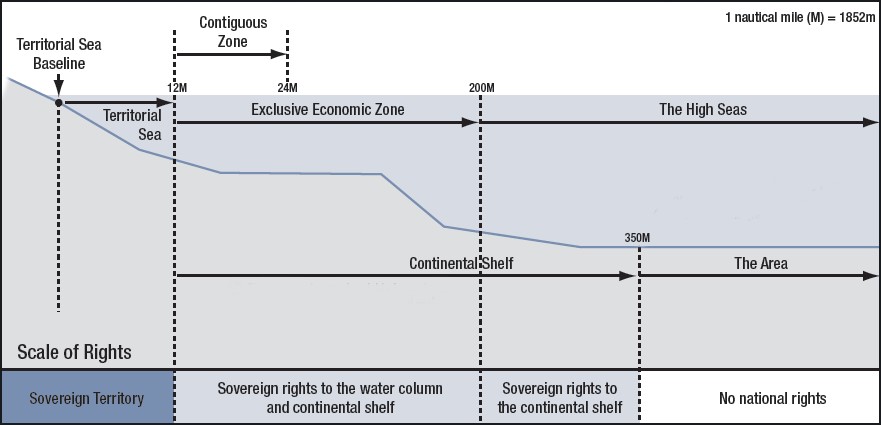 Territorial Sea: In the Territorial Sea, a coastal state has unlimited jurisdiction over all (including foreign) activities unless restrictions are imposed by law. All coastal states have the right to a territorial sea extending 12 nautical miles from the baseline.