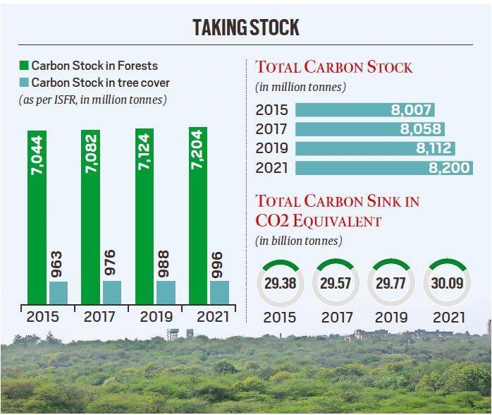 - Since 2015, the carbon sink in the country — which is the total amount of carbon dioxide absorbed by and residing in forests and trees — had increased by 703 million tonnes of CO2 equivalent, or roughly by 120 million tonnes every year.