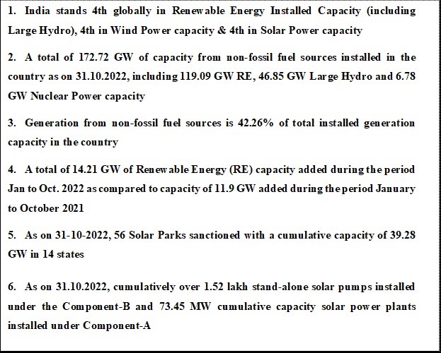 - So far, a total of 172.72 GW of capacity from non-fossil fuel sources has been installed in the country as on 31.10.2022.
