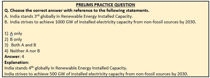 - India stands 4th globally in Renewable Energy Installed Capacity (including Large Hydro), 4th in Wind Power capacity & 4th in Solar Power capacity (as per REN21 Renewables 2022 Global Status Report).