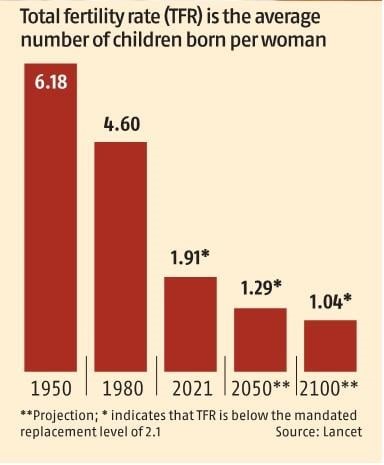 - Global Context: Falling fertility rates are not unique to India but are part of a global trend. The global fertility rate has decreased steadily, dropping nearly 50% in the past 70 years.