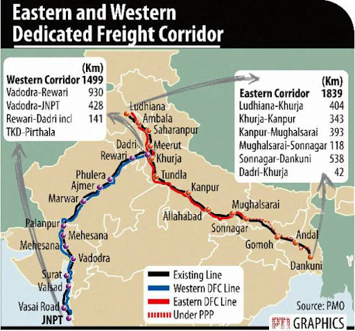Dedicated Freight Corridors (DFCs): The Eastern and Western DFCs segregate freight and passenger traffic to boost freight train average speed from 25 kmph to 70 kmph, moving cargo from road to rail.