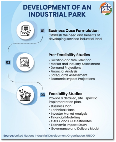 - Shared physical and soft infrastructure: Industrial parks provide common infrastructure such as uninterrupted power, water supply, internal roads, drainage, waste treatment plants, warehouses, testing laboratories, and digital connectivity, which lowers per-unit costs for firms; for example, plug-and-play parks under the National Industrial Corridor Development Corporation Limited offer ready-built industrial sheds and integrated logistics, significantly reducing project gestation periods for manufacturing units.