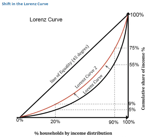 - In this example, there has been a reduction in inequality – the Lorenz curve has moved closer to the line of equality.