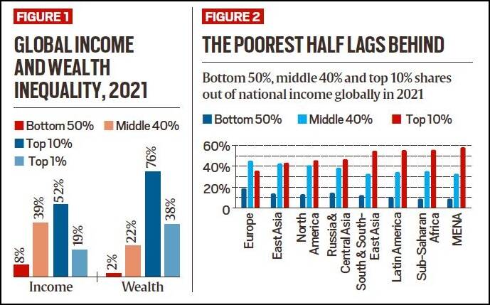 - India stands out as a “poor and very unequal country, with an affluent elite”, where the top 10 per cent holds 57 per cent of the total national income while the bottom 50 per cent’s share is just 13 per cent in 2021, according to the latest World Inequality Report 2022.