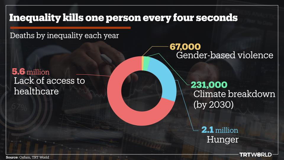 The report described inequality as economic violence, adding that lack of access to health care, gender-based violence, hunger and climate change kill 21,000 people each day.