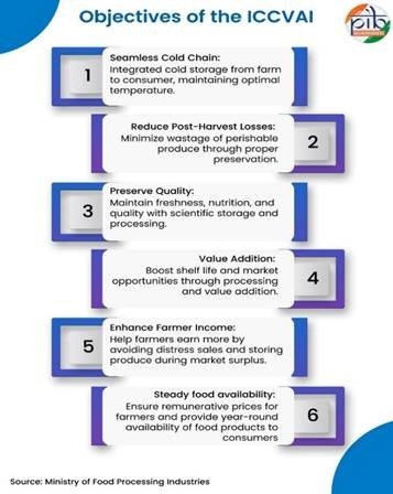 The ICCVAI is a government initiative under the Pradhan Mantri Kisan Sampada Yojana (PMKSY) aimed at reducing post-harvest losses in India’s agriculture sector. It focuses on building a seamless cold chain and value addition infrastructure from the farm gate to the consumer, ensuring that perishable goods such as dairy, meat, poultry, fish, and other non-horticultural products are stored, processed, and transported efficiently.